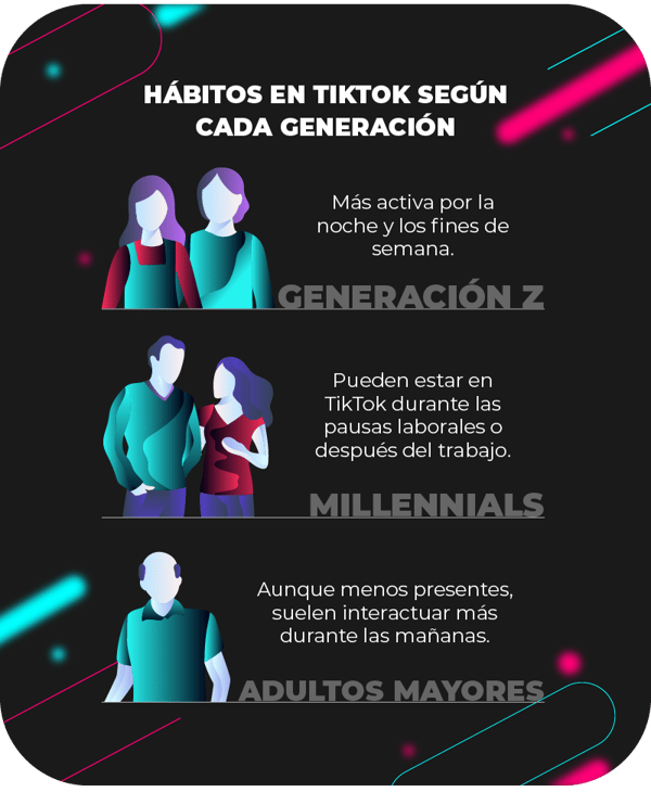 - Hábitos: Los adolescentes y adultos jóvenes suelen revisar TikTok durante momentos de descanso, como al regresar de la escuela o el trabajo.